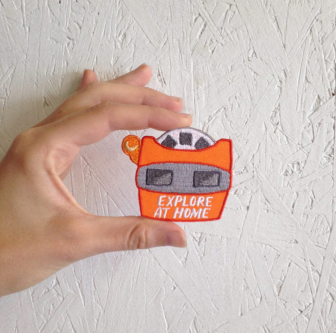 • Embroidered patch of a car with 'EXPLORE AT HOME' text on an orange background