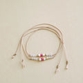 2 Beautiful, dainty and minimalistic string bracelets made from 100% silk string, made with Mother of Pearl and Rose quartz crystal. Special wish for mom and me written on the back of the card.